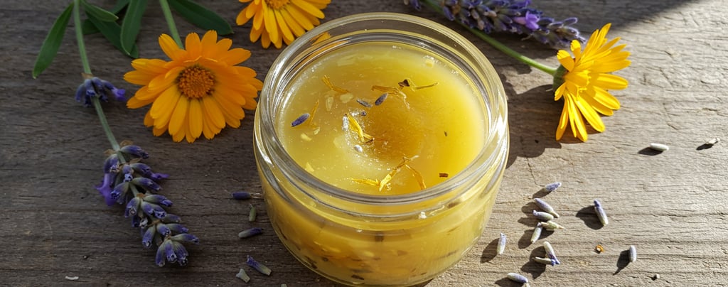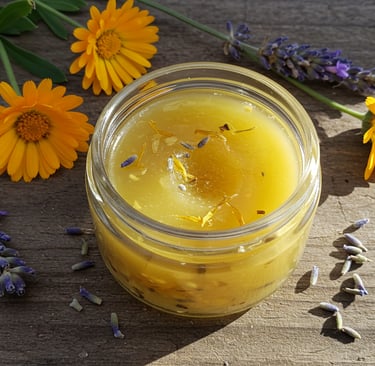 Pomada Tradicional de Lavanda, Caléndula y Cera de Abeja, Diseñada para Hidratar Profundamente, Reparar Irritaciones y Proteger la Piel, es Ideal para tratar Áreas Secas, Agrietadas o Sensibles.